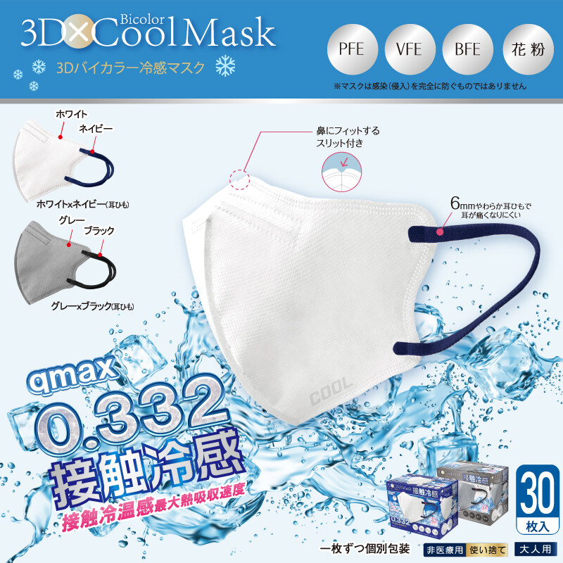 12月の新商品といたしまして、「3Dバイカラー冷感不織布マスク 30枚入り」を追加いたしました。大変お買い得となっておりますので是非ご確認ください。